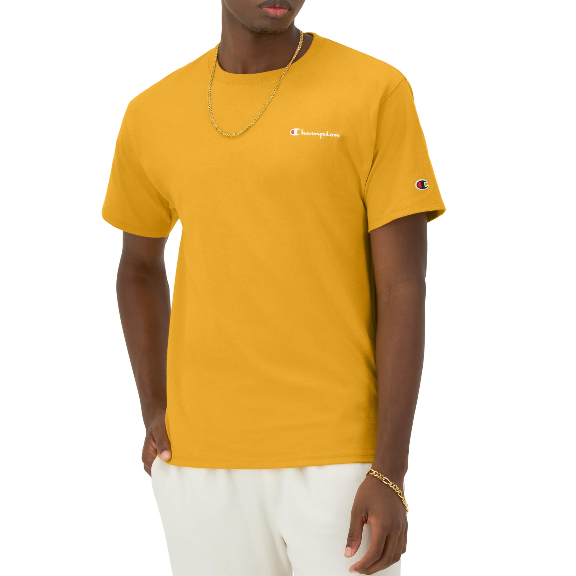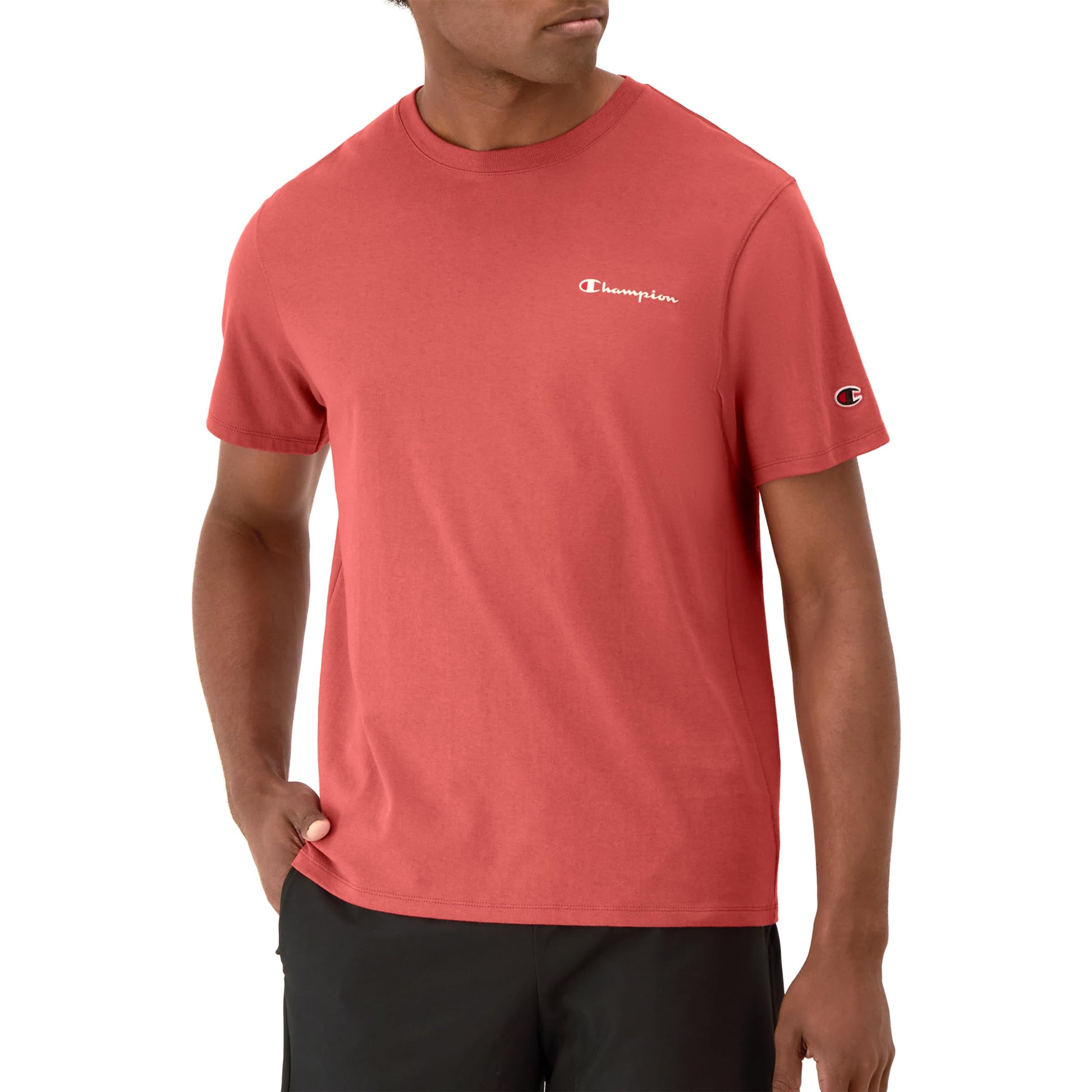 ROLL THE CLASSICS. Basic but in the best way, this men's t-shirt is made with a comfortable, soft cotton or cotton blend that feels great against the skin. Built to last, this tee has a ribbed collar and sturdy stitch work because good quality goes with basically anything. This t-shirt for men comes in tons of colors, from bold blues to basic black, and features signature Champion script. You can pair it with your best Champion jacket for the perfect streetwear look. The iconic C logo hits at the sleeve, sending some authentic vibes your way.